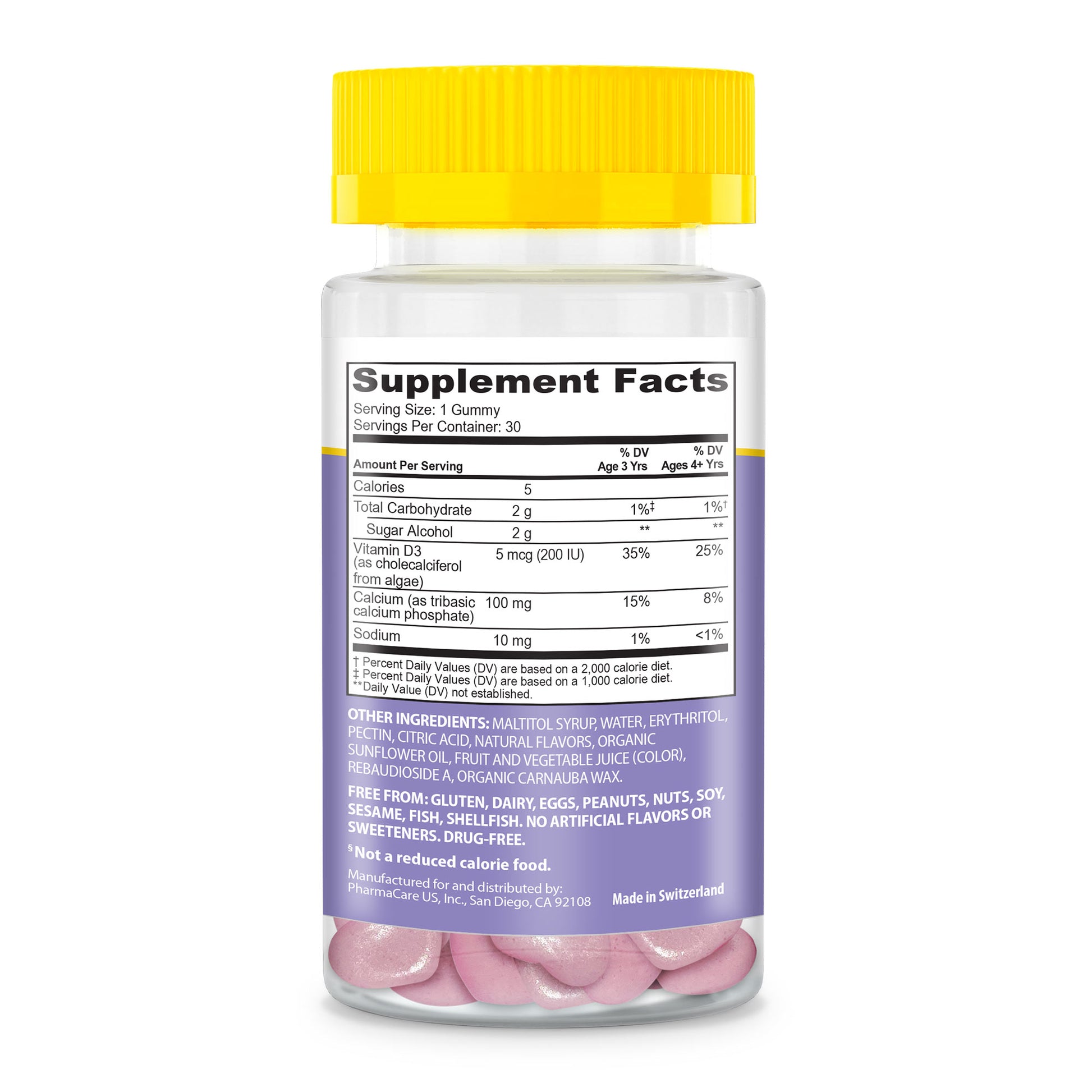 | Vitamin D3 (as cholecalciferol from algae) 5 mcg (200 IU) | 35% | 25% |